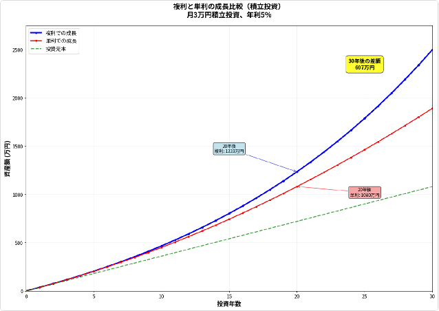 実例で見る複利効果:毎月3万円・年5%・30年間