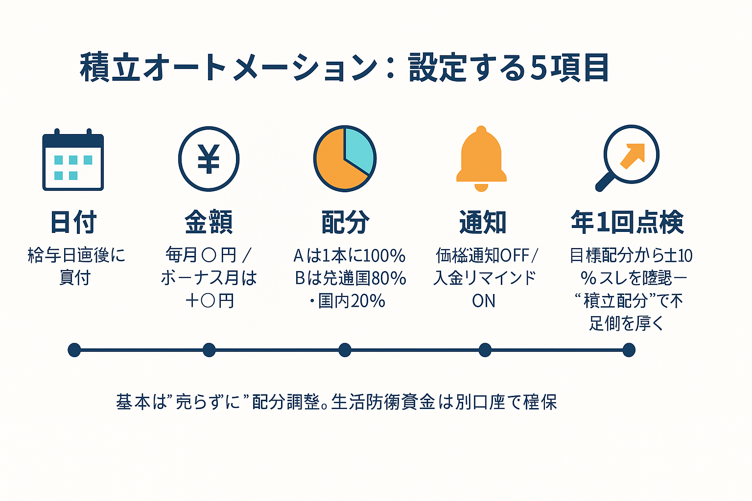- ズレていたら次回以降の“積立配分”で足りない側を厚くする(基本、売らない)