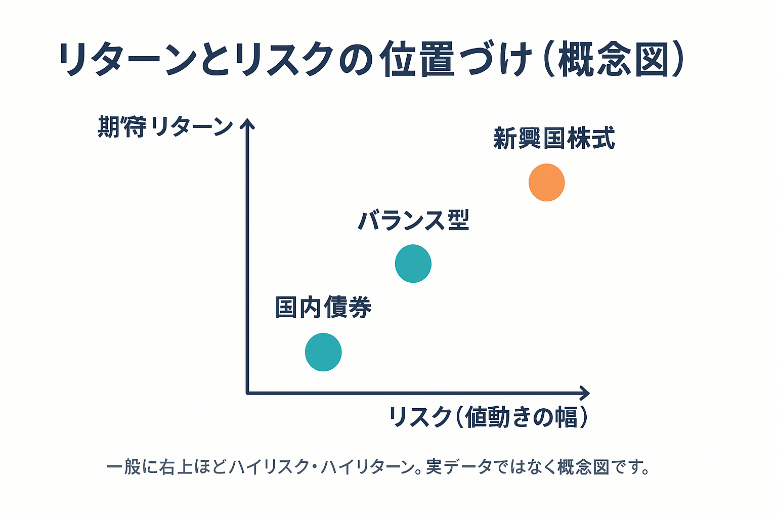 一般的に、期待リターンが高い資産ほど、リスクも大きくなります。例えば、債券よりも株式の方がハイリスク・ハイリターンです。また、先進国株式よりも新興国株式の方が値動きが激しくなりやすい傾向があります。