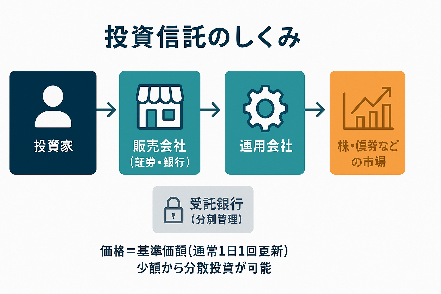 投資信託は、多くの投資家から集めた資金を運用会社がまとめて株や債券に分散投資する仕組みです。購入・解約の窓口は販売会社(証券会社・銀行など)、お金そのものは受託銀行(信託銀行)が分別管理して安全に保管します。価格は基準価額(通常1日1回更新)で決まり、少額から始められます。