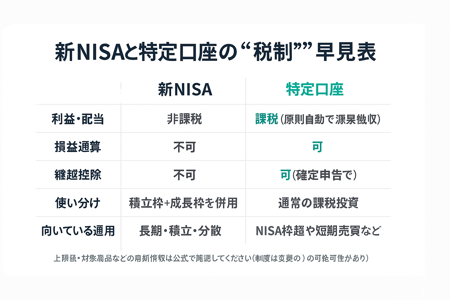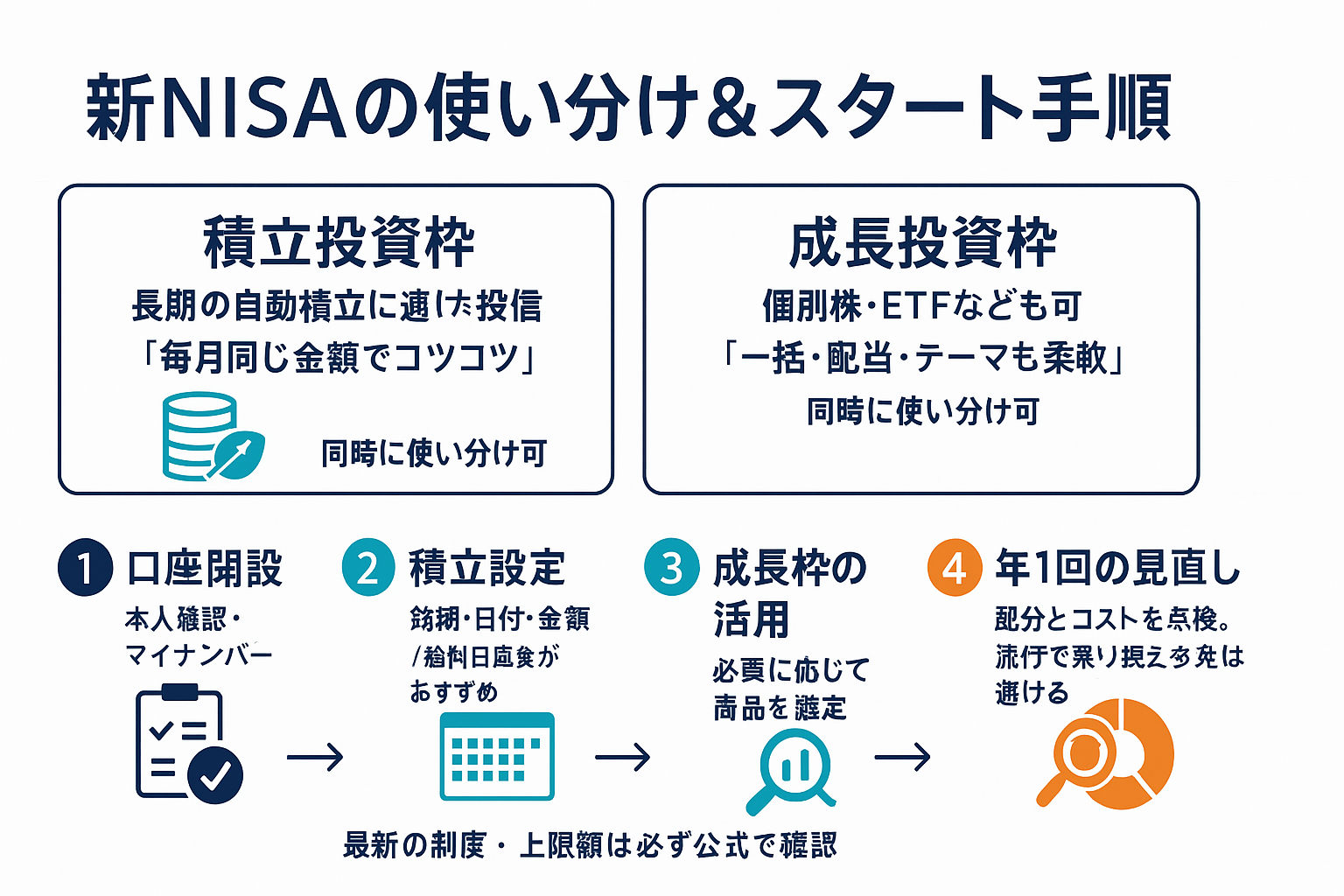 - 2つの枠を併用可能:積立は積立枠、個別株は成長枠など使い分けできる