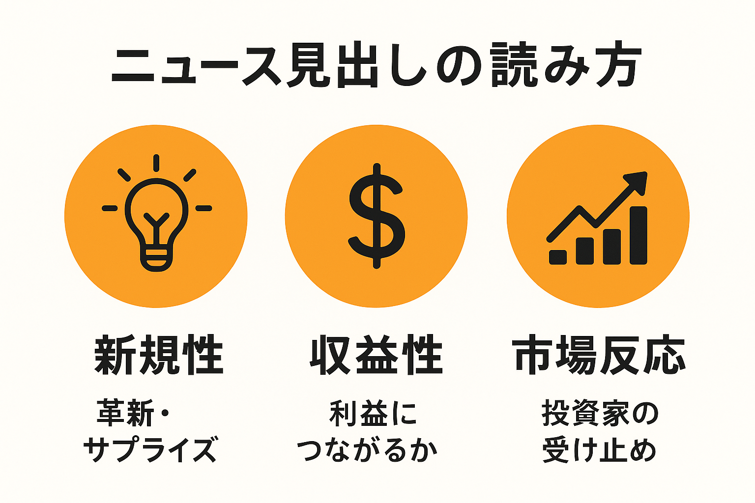- 見出しを読む際は「新規性・収益性・市場反応」の3点に注目すると理解しやすくなります