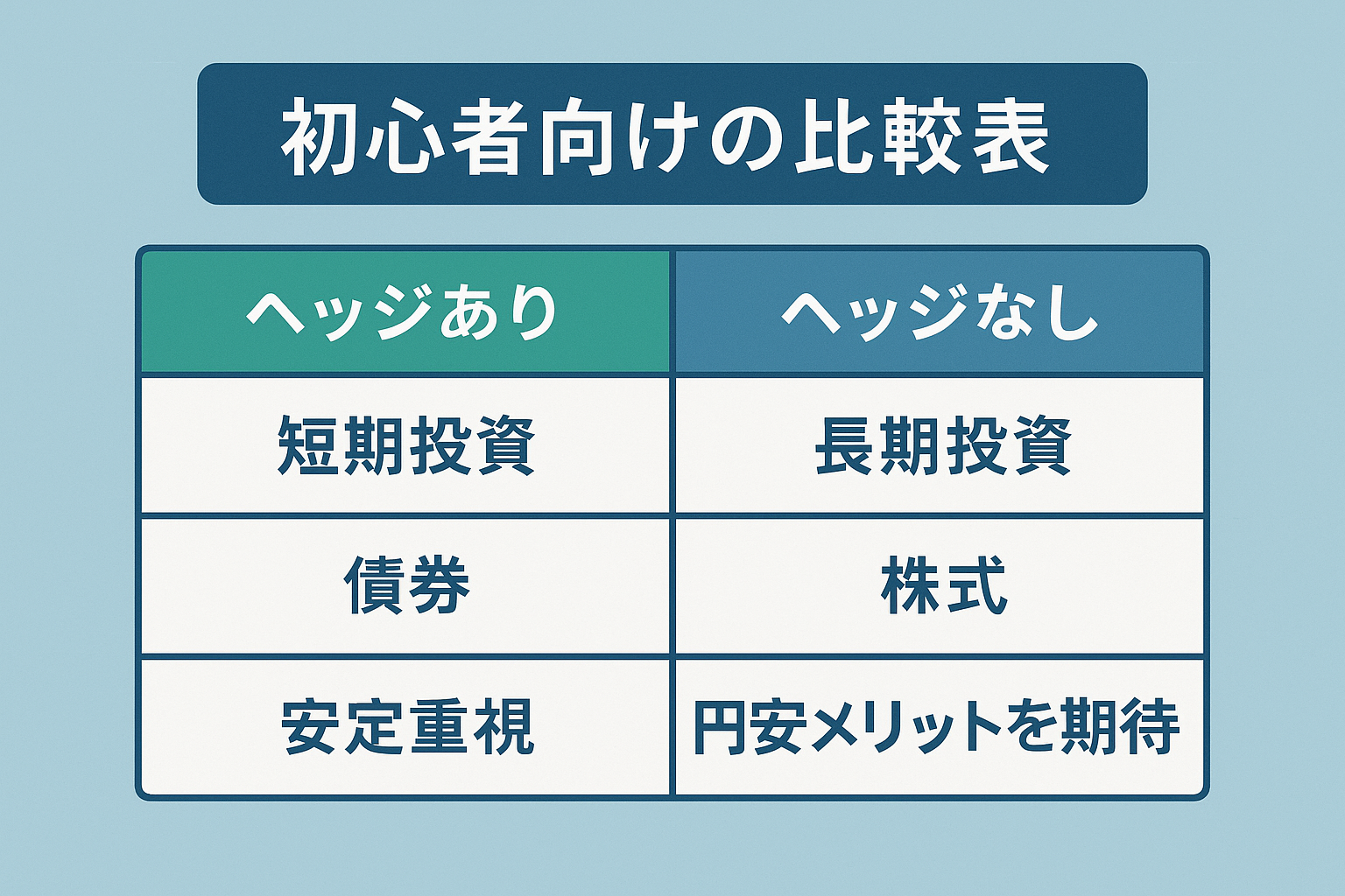 • 投資目的を整理して、「安定重視(債券)ならヘッジあり」「成長重視(株式)ならヘッジなし」を目安にすると分かりやすいでしょう